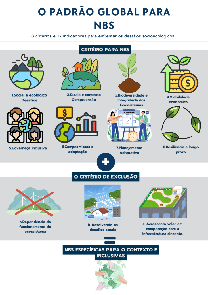 - As NBS devem garantir o envolvimento e a participação inclusivos de todas as partes interessadas (Critério 5 da Norma Global: Governança Inclusiva). A tomada de decisões transparente, o acesso à informação e a participação ativa são cruciais. As NBS, então, precisam ser desenvolvidas com base na compreensão do sistema socioeconômico em que são implementadas.
